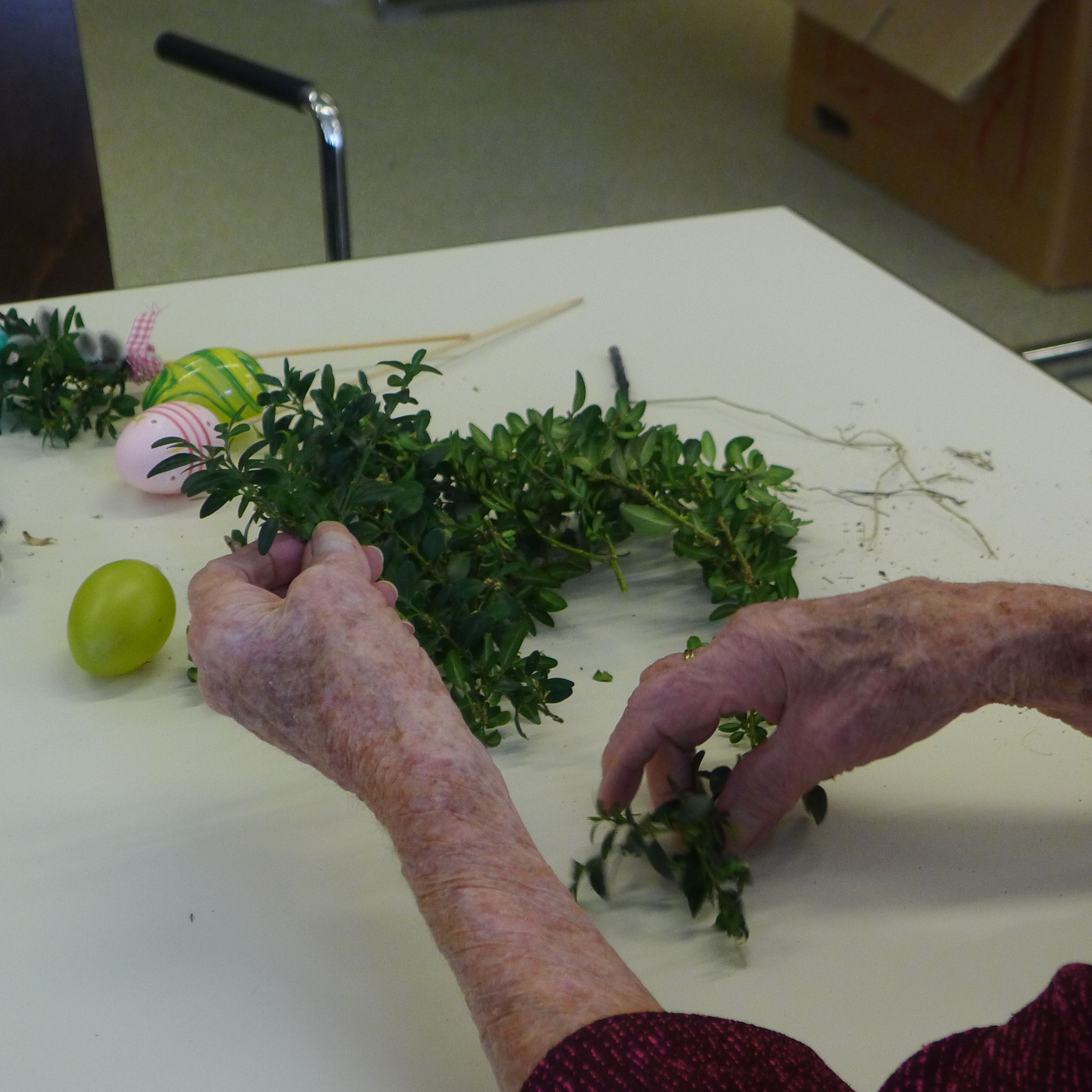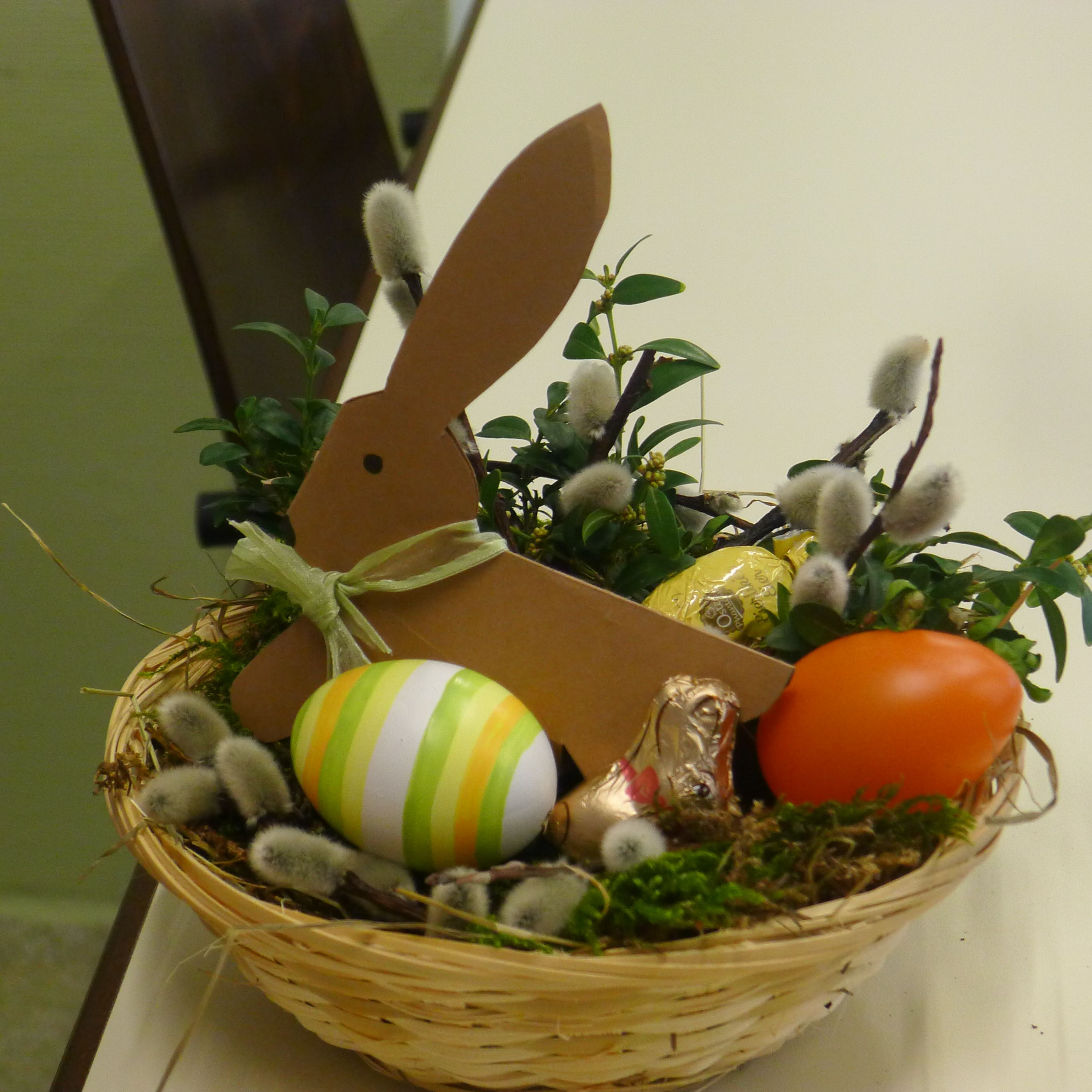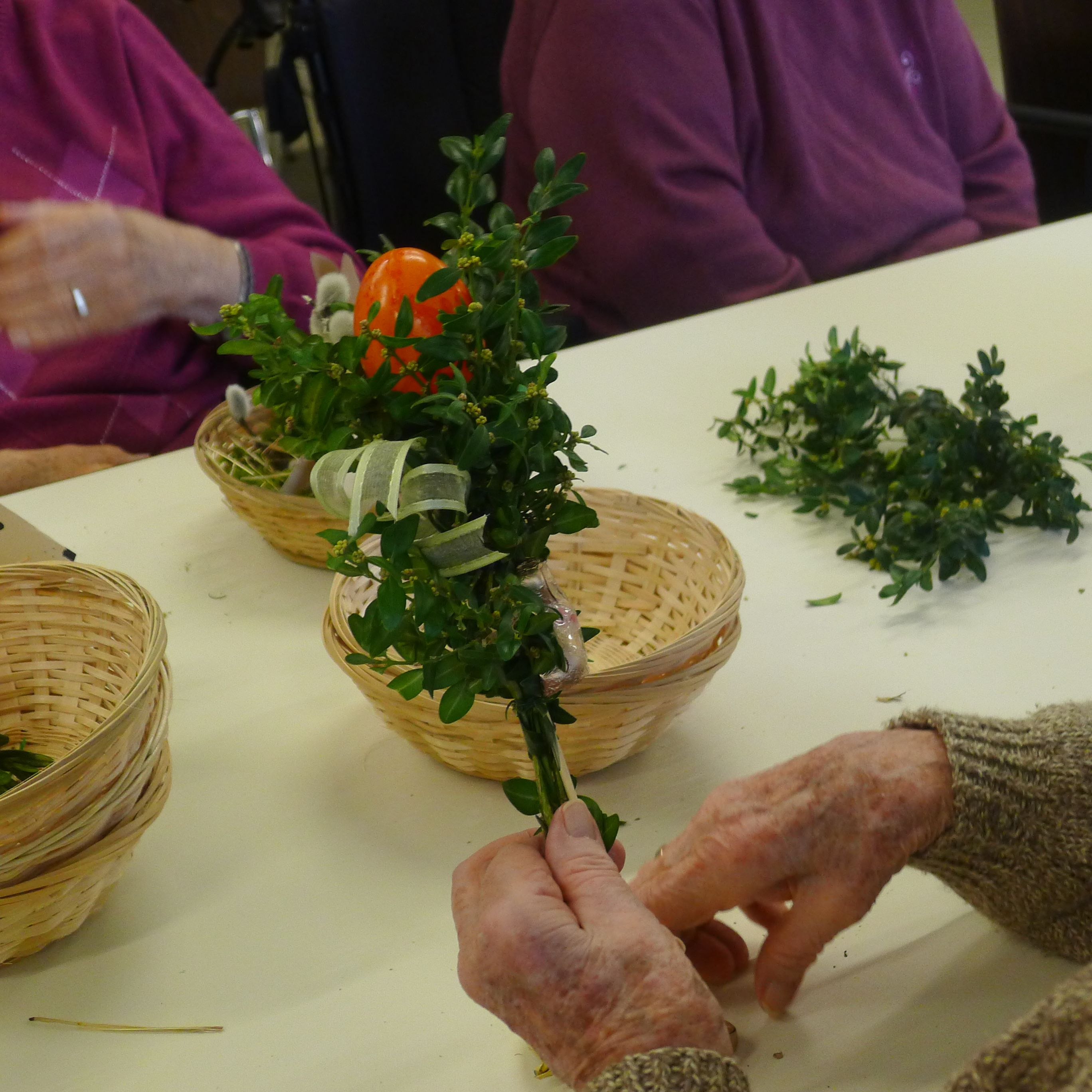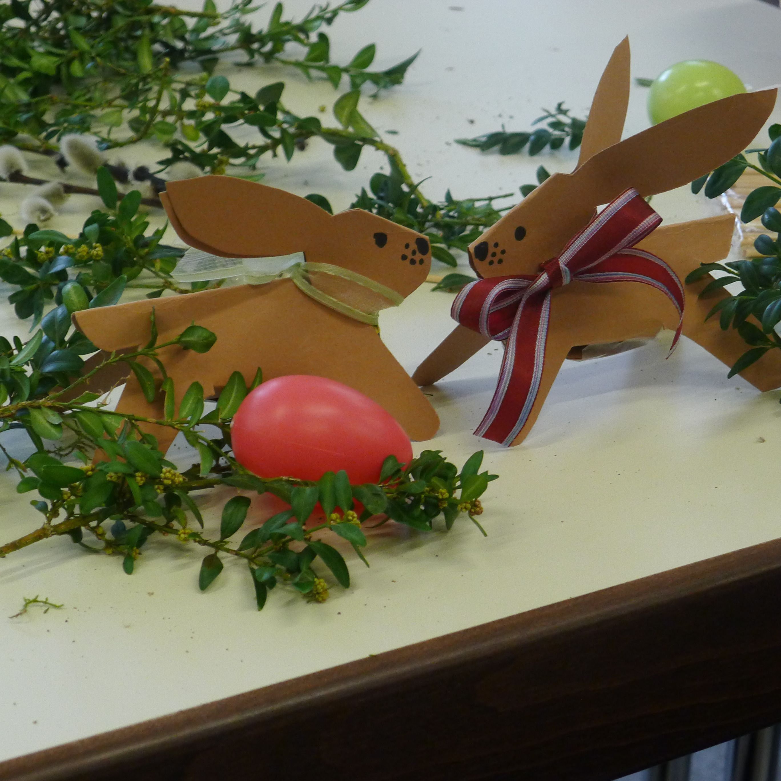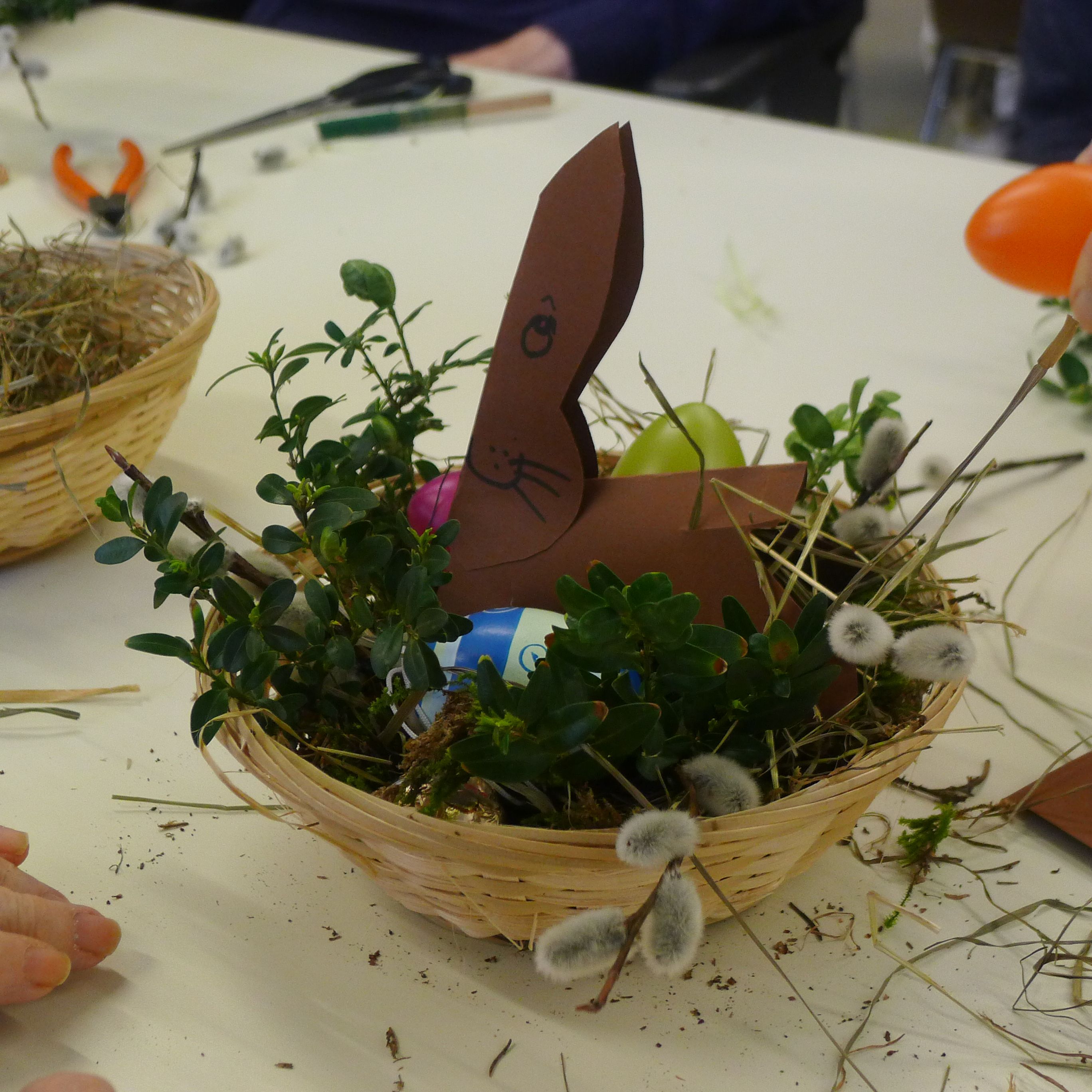 Eine nette Runde hat sich heute vormittag zusammengefunden, um zu basteln: Nester mit Osterhäschen und / oder kleine Ostergestecke. Mit großem Eifer waren die Teilnehmerinnen und Teilnehmer bei der Sache und ein jedes Kunstwerk sah ein wenig anders aus.